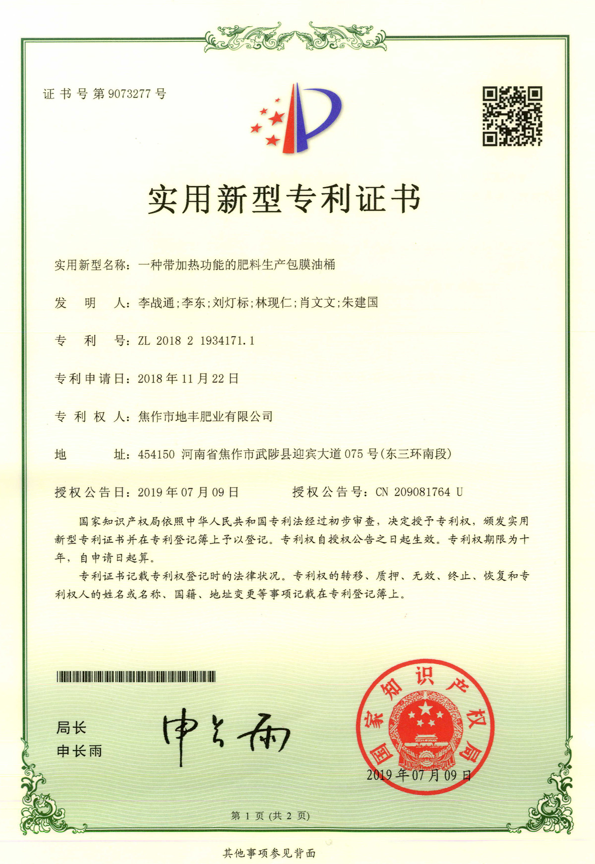 腐殖酸發(fā)明專利證書