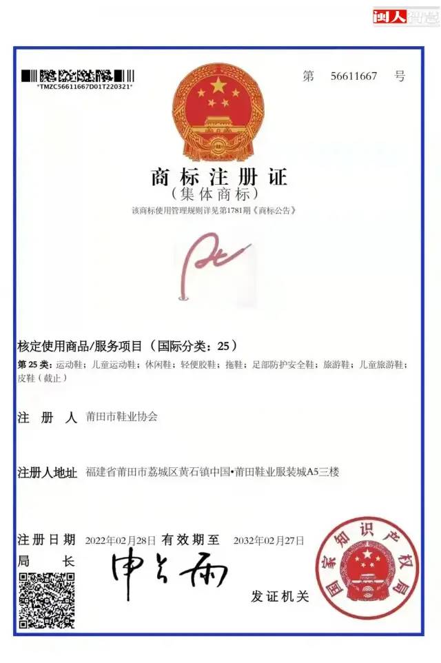 圖:莆田鞋集體商標(biāo)注冊成功 / 來源網(wǎng)絡(luò)